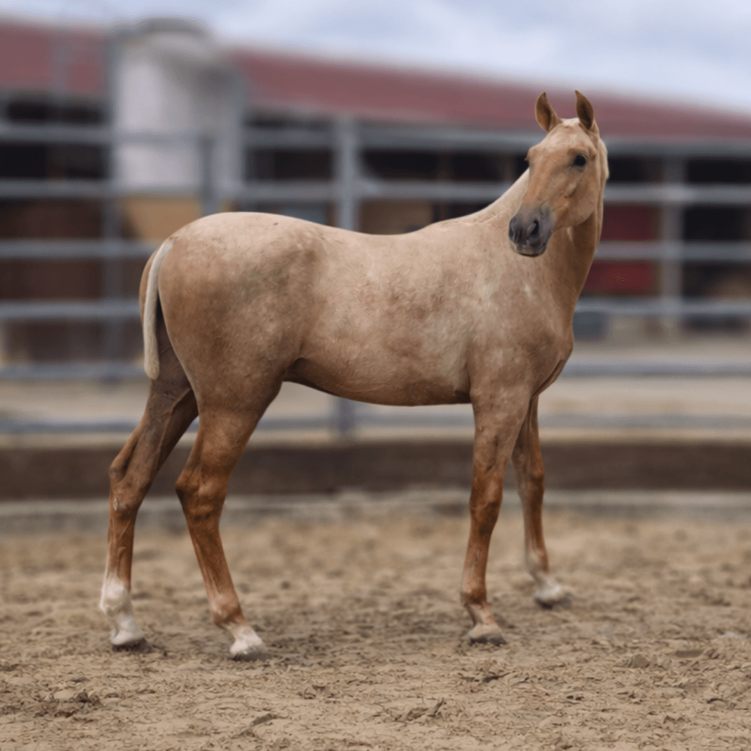 Né en 2025, ce superbe poulain palomino affiche déjà une présence remarquable. Avec 1m52 à seulement un an, Pegaso s’annonce comme un futur grand modèle, harmonieux et distingué. Au-delà de sa robe, il se déplace avec une aisance naturelle : trois allures amples et équilibrées qui captent immédiatement le regard.